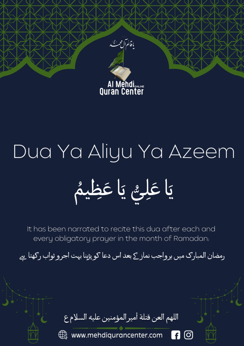 It has been narrated to recite this dua after each and every obligatory prayer in the month of Ramadan. رمضان المبارک میں ہر واجب نماز کے بعد اس دعا کو پڑہنا بہت اجر و ثواب رکھتا ہے Download in PDF بِسْمِ اللهِ الرَّحْمٰنِ الرَّحِيْمِ يَا عَلِيُّ يَا عَظِيمُ ya `aliyyu ya `azimu […]